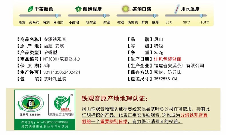 安溪县 凤山铁观音 浓露香永传统烘焙特级浓香型熟茶NT3000碳焙252g礼盒 金色版